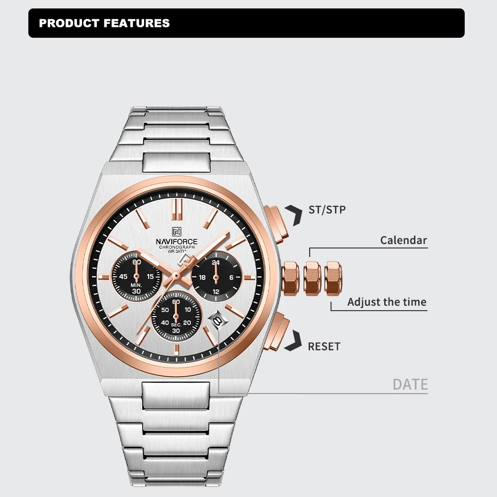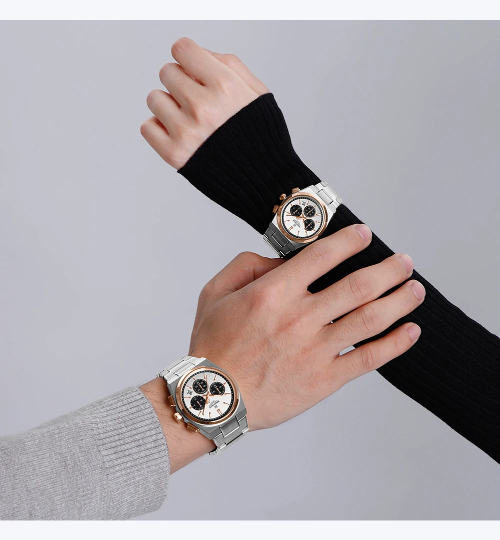 Movement & Versatility: High-precision Quartz movement equipped with a Stop Watch, Perpetual Calendar, and Auto Date features.