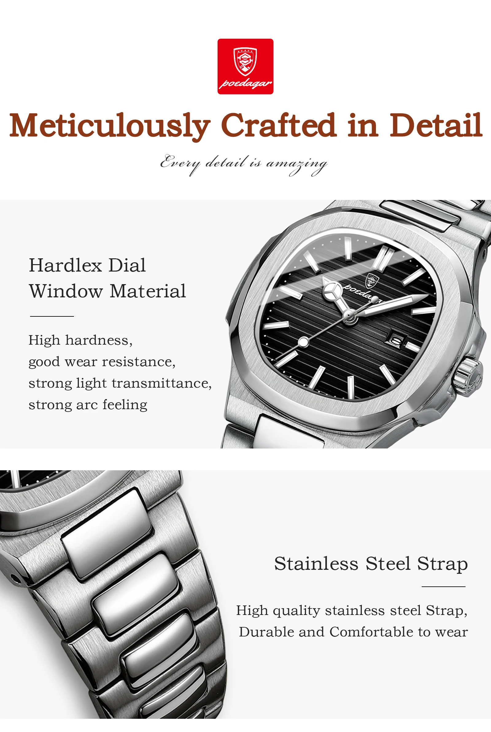 Complete Presentation: Arrives in an official POEDAGAR Box, complete with a Watchband adjust tool, a soft cleaning wipe, and a Warranty card.